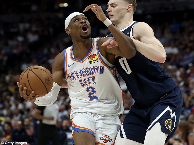 DENVER, COLORADO - MAY 11: Shai Gilgeous-Alexander #2 of the Oklahoma City Thunder dribbles the ball against Christian Braun #0 of the Denver Nuggets during the third quarter in Game Four of the Western Conference Second Round NBA Playoffs at Ball Arena on May 11, 2025 in Denver, Colorado. NOTE TO USER: User expressly acknowledges and agrees that, by downloading and or using this photograph, User is consenting to the terms and conditions of the Getty Images License Agreement. (Photo by Matthew Stockman/Getty Images)