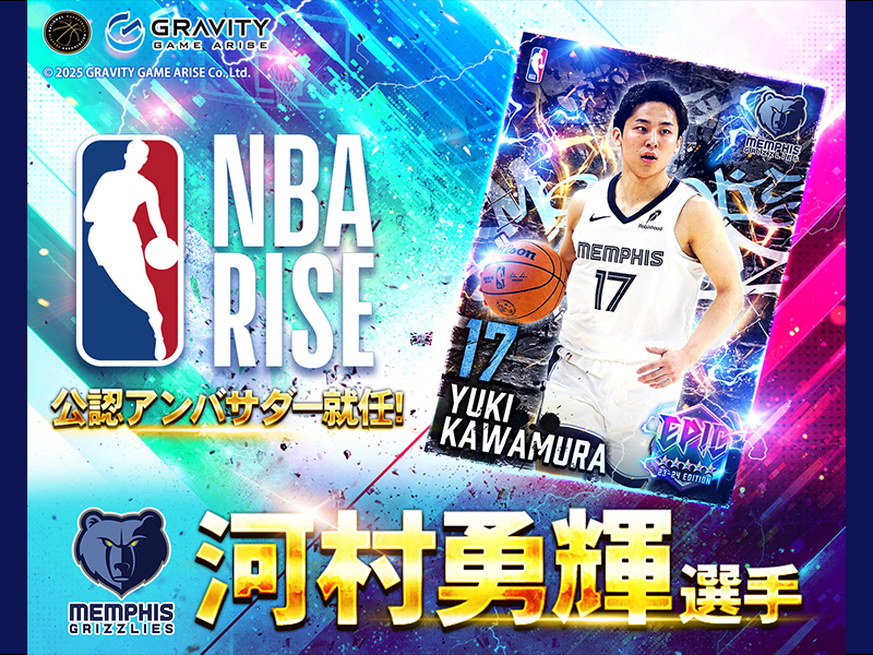 グラビティゲームアライズ株式会社は7月10日、NBA公式バスケットボールシミュレーションゲーム『NBA RISE』において、河村勇輝がアンバサダーに就任したことを発表した。河村は昨シーズン、メンフィス・グリズリーズでNBA公式戦に出場し、日本人としては史上4人目のNBAプレーヤーとなった。現在はフリーエージェント(FA)として新たな契約先を探しており、今夏はシカゴ・ブルズの一員としてサマーリーグに挑戦している。