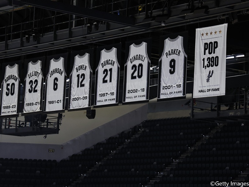 その周囲には5度の優勝すべてを主力として勝ち獲ったティム・ダンカン(21番)、4度の優勝に大きく貢献したマヌ・ジノビリ(20番)とトニー・パーカー(9番)もあり、ポポビッチHCも含めて彼らは全員、バスケットボール殿堂入りを果たしている。