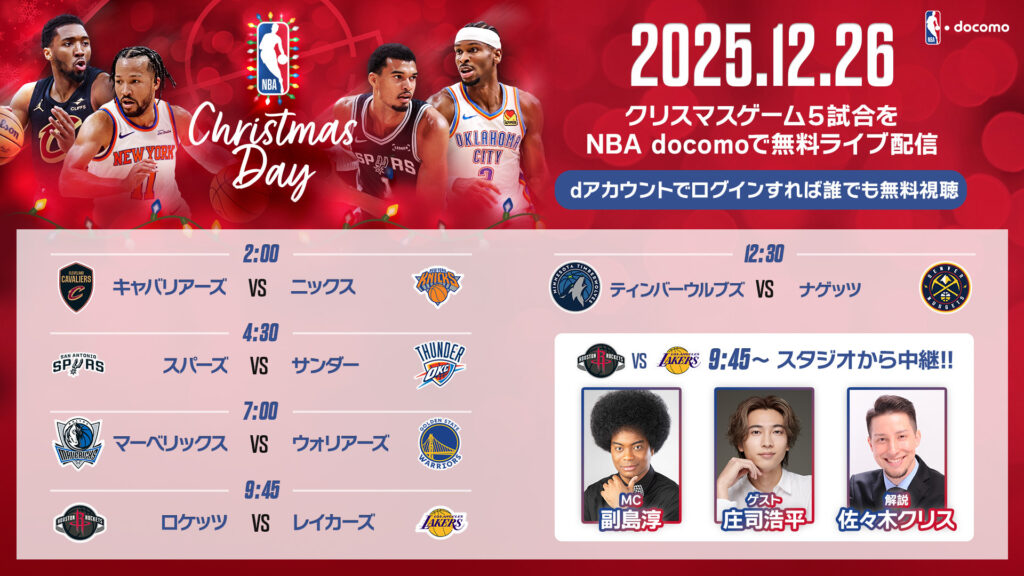 NBA docomoでは5試合すべてを日本語実況・解説付きで無料配信する。ロサンゼルス・レイカーズ対ヒューストン・ロケッツの試合は、MCに副島淳氏、解説に佐々木クリス氏、ゲストに俳優の庄司浩平氏を迎えることが決定。