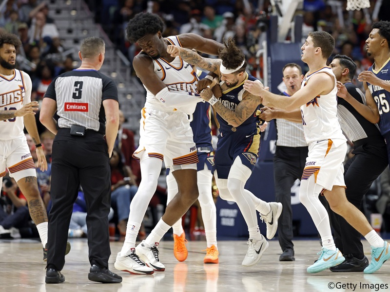 両チームはペリカンズのホーム、スムージーキング・センターで27、28日に2連戦へ臨み、アウェーのサンズがどちらも勝利。だが2戦目となった28日の第3クォーター残り2分6秒の場面で乱闘に発展。