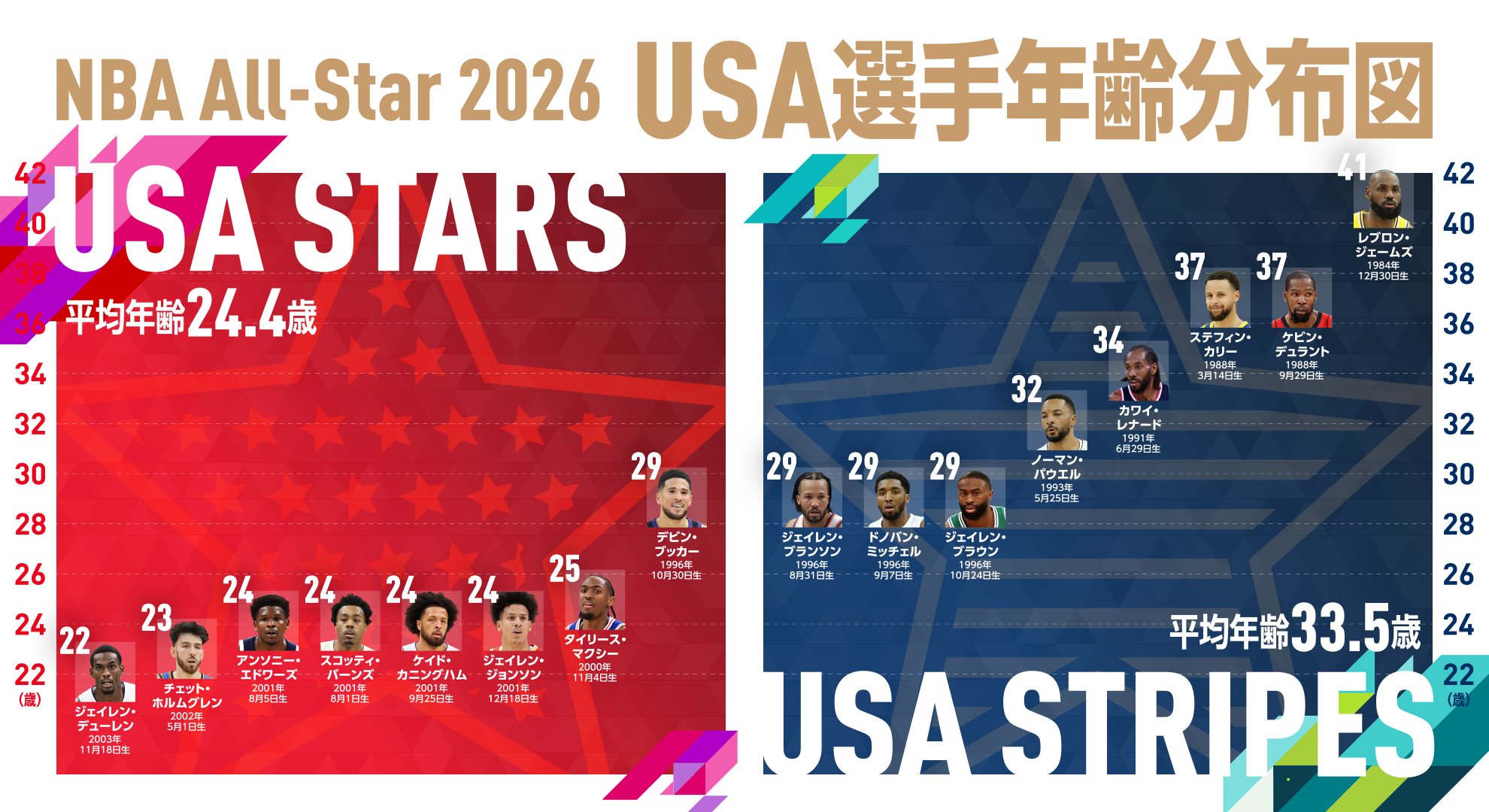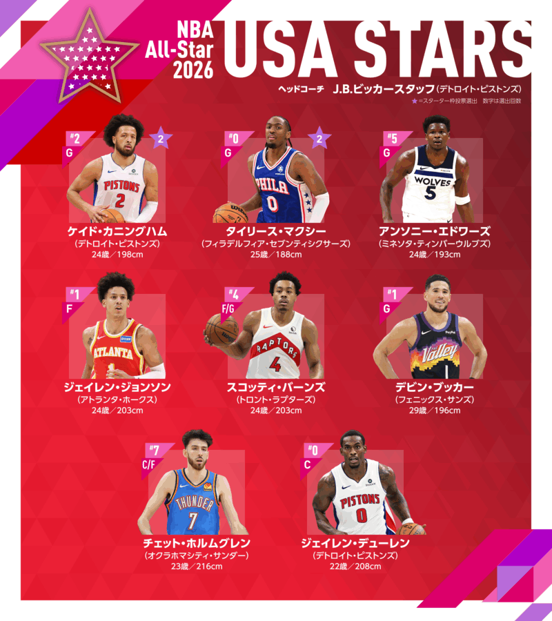 アメリカ国外出身選手で構成される「WORLD」、アメリカ出身の若手「USA STARS」、そしてアメリカ出身のベテラン「USA STRIPES」。新フォーマットで行われる夢の祭典は、単なるお祭りではなく、“どの世代・どのバックグラウンドが今のNBAを象徴しているのか”を映し出す舞台にもなりそうだ。
