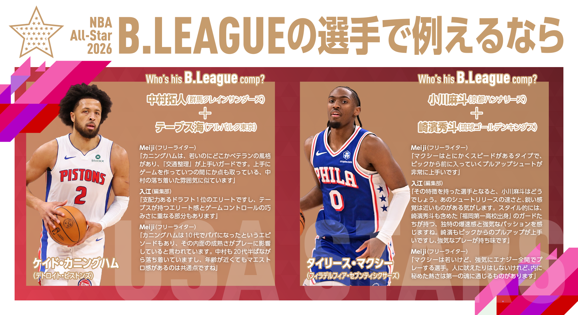 そんな視点から、クリエイティブプロデューサーのMeiji氏とバスケットボールキング編集部の入江美紀雄が考察した特別企画も展開している。同企画で取り上げているのは、今回のオールスターでスターターに選出された10選手。