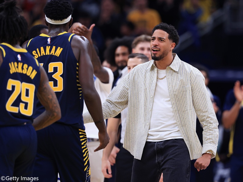 ファイナル第7戦でアキレス腱を断裂したタイリース・ハリバートンは、今シーズン全休も、試合中はベンチ入りしてチームメートたちを鼓舞している。