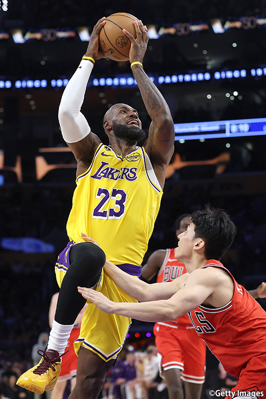 ロサンゼルス・レイカーズのクリプト・ドットコム・アリーナで3月13日(現地時間12日)に行われたレイカーズ対シカゴ・ブルズ(以降ブルズ)。伝統のある球団同士の対戦で、ブルズの河村勇輝が第2クォーターからコートに立った。レイカーズの八村塁が2023年1月にトレード加入して以来努力を重ね、チームにとって不可欠なロールプレーヤーとして成長してきたコートだ。1試合だけではあったが不出場に終わった試合での悔しさ、またパスを十分に得られず無得点に終わった試合も経験した。八村が前を見続けてきたその同じコートで、河村もまた必死の思いで前進しようとしていた。