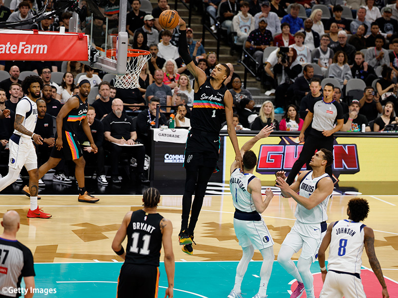 群雄割拠のNBA、世代交代の最前線にいるのが、ヴィクター・ウェンバンヤマだ。「エイリアン」の異名は規格外のサイズと、それに似つかぬスキルに由来する。身長は、NBA最長の224センチ。これはモンスターボックス(跳び箱)15段の高さに匹敵するもので、立ったまま手を上に伸ばした際のリーチは約295センチまで到達する(※NBAのリングの高さは約305センチ)。高度から繰り出されるブロックショットは同選手の代名詞であり、オフェンスではスムーズなハンドリング、成功率約35パーセントのスリーポイントまで装備。シーズン前にはアジアを旅して、中国滞在時には可動域、強度、バランスを改善するべく、坊主頭で少林寺を体験し、その後は日本にも訪れ、ドン・キホーテでのショッピングや富士山観光を楽しんだ。アジアの文化に触れて進化を遂げたMVP候補のプレーは一見の価値アリだ。