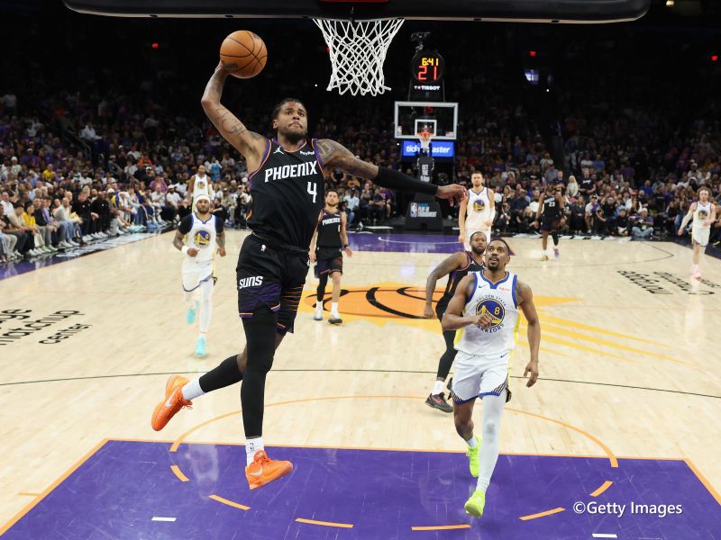 試合は序盤、ターンオーバーを繰り返してリズムに乗れないウォリアーズに対し、サンズが13-2のランで主導権を握る。サンズは第1クォーターを33-15で終え、ウォリアーズのフィールドゴール成功率を30パーセント(3ポイントは9本中1本成功)に抑えた。第2クォーターでは立て直したウォリアーズに追い上げられ、一時は2点差まで詰め寄られるが、ジェイレン・グリーンの3ポイントなどでリードを守り、50-45で前半を折り返した。