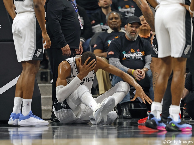ところが、第2クォーター残り8分57秒にアクシデントが発生。ウェンバンヤマがドリュー・ホリデー(ブレイザーズ)相手にドライブでリングへ向かった際に接触して体勢を崩して転倒。顎からコートへ倒れ込んだことで一瞬目を閉じ、意識を失ったように見えた。