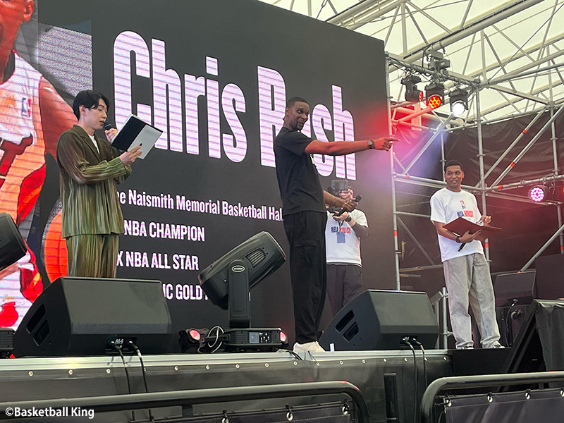 最後のテーマは「BIG3対決どっちが強い?」。「2012年、2013年に優勝のマイアミ・ヒート」と「2008年優勝のボストン・セルティックス(ポール・ピアース氏、レイ・アレン氏、ケビン・ガーネット氏)」がピックアップされると、ヒートでレブロン・ジェームズ(レイカーズ)、ドウェイン・ウェイド氏とともに“スリーキングス”を結成したクリス・ボッシュ氏がスペシャルゲストとして登壇した。11度のオールスター選出を誇る“レジェンド”は「僕たちのほうだよ。うますぎて、レイ・アレンがこっちに飛び乗ってきたんだ(※2012-13シーズンにセルティックスからヒートへ移籍)」と語り、会場の笑いを誘った。