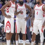 オフェンスの柱ハーデン(中央)と、ディフェンス面でチームに貢献するトレバー・アリーザ(左)とP.J.タッカー(右)[写真]=Getty Images