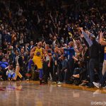 カリーがチームを勢いに乗せるプレーを魅せたあとに観客と一体化し、異様な盛り上がりを見せるオラクル・アリーナ[写真]=Getty Images
