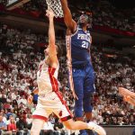 万能型ビッグマンのエンビードは、ヒートとのシリーズで平均3.0ブロックをたたき落とし、ペイント内で脅威を与えた[写真]=Getty Images