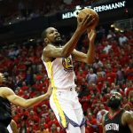 後半が始まると、第3クォーターに強いウォリアーズが、デュラントの猛攻などでロケッツを追撃。残り7分42秒で10点差としたのだが、ロケッツもポールを中心にスコアを伸ばし、2ケタリードを譲らず。結局このクォーターを終えて95-79。ロケッツ優勢のまま最終クォーターへ。