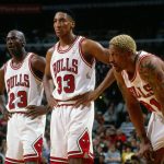 90年代後半。ジョーダン(左)はピペン(中央)やロッドマン(右)と共に役割分担を行い、90年代2度目の3連覇を果たした[写真]=Getty Images