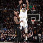 イグダーラのビハインド・ザ・バックパスから右コーナーでトンプソンが鮮やかな3ポイントシュートを決めると、デュラントの3ポインターも続き、キャブスを射程圏内に捉える。