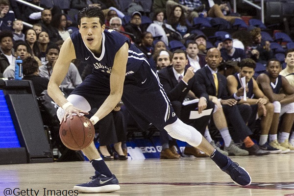 WASHINGTON, DC - MARCH 08: George Washington Colonials guard Yuta Watanabe (12) picks up a low pass during a second round game of the 2018 Atlantic 10 men's basketball championship between the Saint Louis Billikens and the George Washington Colonials on March 8, 2018, at Capital One Arena, in Washington D.C. Saint Louis defeated George Washington 70-63.(Photo by Tony Quinn/Icon Sportswire via Getty Images)