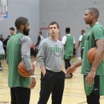 チーム練習を行うセルティックス(左からカイリー、スティーブンズHC、ホーフォード)[写真]=Getty Images