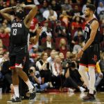 ハーデン(左)やポールの個人成績は悪くないものの、昨季ほどの勢いがないロケッツ[写真]=Getty Images