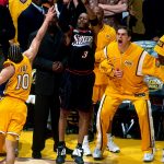 圧倒的に不利と予想されたファイナルの初戦。アイバーソンは48得点の大暴れで延長の末にレイカーズを下した[写真]=Getty Images