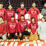 試合開始早々、渡邊選手の3ポイントや速攻からのボースハンドダンクに大いに盛り上がる。残念ながら第2Q途中で相手選手と接触してロッカーに下がり、その後、渡邊選手は脳震盪の疑いありとプレーは行わなかったが、ハッスルが118-98で快勝。最後まで試合を楽しむことができたことだろう。最後はセンターサークルのチームロゴが配されている場所で記念撮影を行い、一行はホテルへの帰路についた。