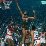 NBA通算得点で歴代1位となる3万8,387得点という偉大な記録を持つジャバーは、キャリア初期にバックスで6シーズンをプレー。467試合に出場して平均42.7分30.4得点15.3リバウンド4.3アシスト1.2スティール3.4ブロックというとてつもない成績を残してきた。