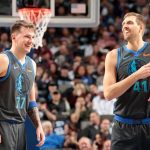 ファンの大歓声に笑顔を見せるノビツキー(右)とチームトップの28得点を挙げたドンチッチ(左)[写真]=Getty Images