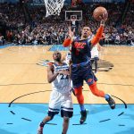 第4クォーター序盤。ウルブズはゴーギー・ジェンとダリオ・シャリッチの3ポイントなどで先行し、一時はリードを10点にまで広げていく。だがホームで負けられないサンダーは2大エースのラッセル・ウェストブルックとポール・ジョージの3ポイントで一気に3点差まで詰め寄り、射程圏内へ。