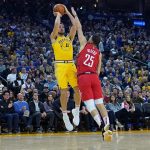 王者ウォリアーズのカリーとトンプソン(左)にも好ディフェンスを見せているリバース(右)[写真]=Getty Images