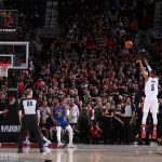4度目の延長終盤。フッドの左手から放たれた3ポイントがブレイザーズを勝利へと導いた[写真]=Getty Images