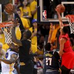 16年のファイナル第7戦でレブロンが決めたブロック(左)と、マッカラムがマレーに浴びせたブロック(右)[写真]=Getty Images