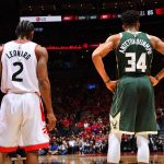 バックスの大黒柱アデトクンボ(右)とラプターズのエースを務めるレナード(左)。第4戦で勝利をつかむのはどっちだ?[写真]=Getty Images