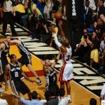 スパーズはレブロンの3ポイントがリムに嫌われてしまい、優勝が決まったかに思われたものの、クリス・ボッシュ(元ラプターズほか)が執念でオフェンシブ・リバウンドをもぎ取ると、右コーナーへとバックステップで戻ったレイ・アレン(元ボストン・セルティックスほか)へとつなぎ、残り5.2秒で延長へと持ち込む同点3ポイントをヒット。