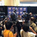 会見には多くの日本メディアが八村を囲んだ [写真]=バスケットボールキング
