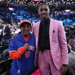 開催地ニューヨークに本拠地を置くニックスから指名されたバレット(右)は、熱狂的なニックスファンとして知られるスパイク・リー(左)と写真撮影[写真]=Getty Images
