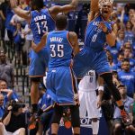 サンダーでデュラント(中央)と共に3シーズンをプレーしたハーデン(左)とウェストブルック(右)[写真]=Getty Images