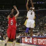 この日のレイカーズは前半を終えて49-63と劣勢だったものの、後半に入ってコービーが12連続得点で追い上げを図る。だがラプターズもクリス・ボッシュやモーリス・ピーターソン(共に元ラプターズほか)、ジェイレン・ローズ(元インディアナ・ペイサーズほか)が加点し、第3クォーター中盤まで2ケタリードを死守。