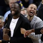 コート外でも仲の良さを感じさせるカリー(右)とグリーン(左)[写真]=Getty Images