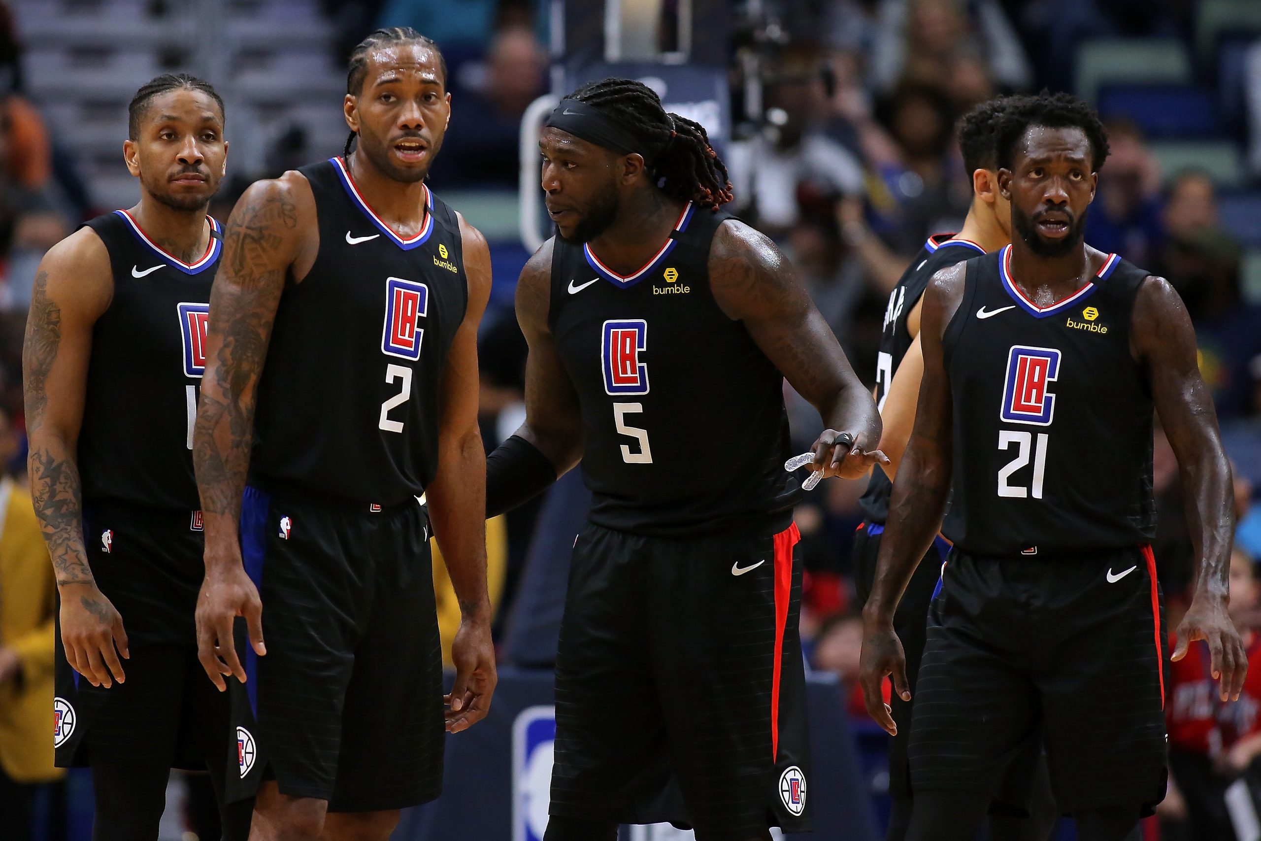 NEW ORLEANS, LOUISIANA - JANUARY 18: Kawhi Leonard #2 of the LA Clippers, Montrezl Harrell #5, Landry Shamet #20 and Patrick Beverley #21 talk during a game against the New Orleans Pelicans at the Smoothie King Center on January 18, 2020 in New Orleans, Louisiana. NOTE TO USER: User expressly acknowledges and agrees that, by downloading and or using this Photograph, user is consenting to the terms and conditions of the Getty Images License Agreement. (Photo by Jonathan Bachman/Getty Images)