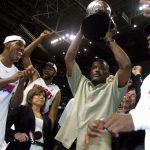 選手として2度、フロントとしてもピストンズで優勝を飾ったデュマース(中央)[写真]=Getty Images