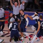 ドンチッチ(中央)のブザービーターが決まり、大エースを祝福するマブスの選手たち[写真]=Getty Images