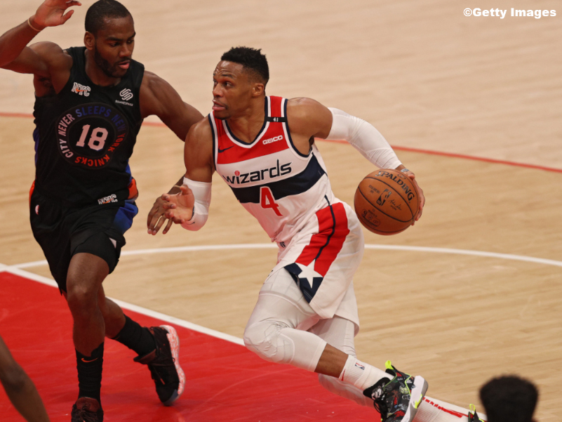 WASHINGTON, DC - FEBRUARY 12: Russell Westbrook #4 of the Washington Wizards dribbles the ball against the New York Knicks during the first half at Capital One Arena on February 12, 2021 in Washington, DC. NOTE TO USER: User expressly acknowledges and agrees that, by downloading and or using this photograph, User is consenting to the terms and conditions of the Getty Images License Agreement. (Photo by Patrick Smith/Getty Images) (Photo by Patrick Smith/Getty Images)