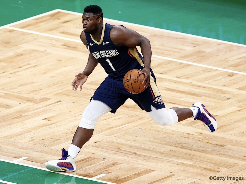 BOSTON, MASSACHUSETTS - MARCH 29: Zion Williamson #1 of the New Orleans Pelicans dribbles against the Boston Celtics during the second half at TD Garden on March 29, 2021 in Boston, Massachusetts. The Pelicans defeat the Celtics 115-109. (Photo by Maddie Meyer/Getty Images)