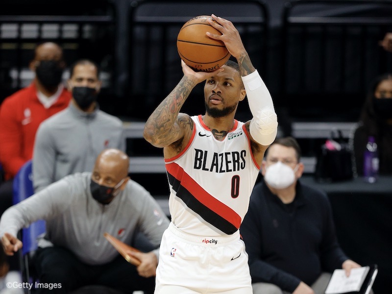 PORTLAND, OREGON - MARCH 23: Damian Lillard #0 of the Portland Trail Blazers shoots a three-point basket against the Brooklyn Nets during the third quarter at Moda Center on March 23, 2021 in Portland, Oregon. NOTE TO USER: User expressly acknowledges and agrees that, by downloading and or using this photograph, User is consenting to the terms and conditions of the Getty Images License Agreement. (Photo by Steph Chambers/Getty Images)