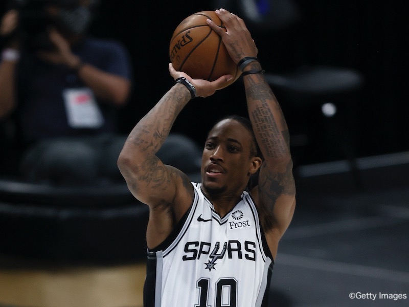 DALLAS, TEXAS - APRIL 11: DeMar DeRozan #10 of the San Antonio Spurs shoots the ball against Kristaps Porzingis #6 of the Dallas Mavericks in the second quarter at American Airlines Center on April 11, 2021 in Dallas, Texas. NOTE TO USER: User expressly acknowledges and agrees that, by downloading and or using this photograph, User is consenting to the terms and conditions of the Getty Images License Agreement. (Photo by Tom Pennington/Getty Images)
