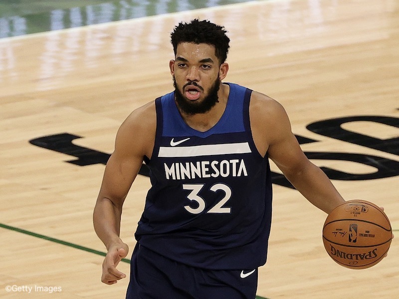 MILWAUKEE, WISCONSIN - FEBRUARY 23: Karl-Anthony Towns #32 of the Minnesota Timberwolves handles the ball during a game against the Milwaukee Bucks at Fiserv Forum on February 23, 2021 in Milwaukee, Wisconsin. NOTE TO USER: User expressly acknowledges and agrees that, by downloading and or using this photograph, User is consenting to the terms and conditions of the Getty Images License Agreement. (Photo by Stacy Revere/Getty Images)