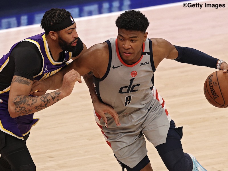 WASHINGTON, DC - APRIL 28: Rui Hachimura #8 of the Washington Wizards dribbles past Anthony Davis #3 of the Los Angeles Lakers during the first half at Capital One Arena on April 28, 2021 in Washington, DC. NOTE TO USER: User expressly acknowledges and agrees that, by downloading and or using this photograph, User is consenting to the terms and conditions of the Getty Images License Agreement. (Photo by Patrick Smith/Getty Images)