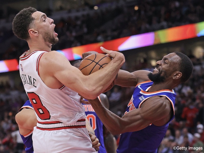 CHICAGO, ILLINOIS - OCTOBER 28: Kemba Walker #8 of the New York Knicks forces a jump ball with Zach LaVine #8 of the Chicago Bulls at the United Center on October 28, 2021 in Chicago, Illinois. The Knicks defeated the Bulls 104-103. NOTE TO USER: User expressly acknowledges and agrees that, by downloading and or using this photograph, User is consenting to the terms and conditions of the Getty Images License Agreement. (Photo by Jonathan Daniel/Getty Images)