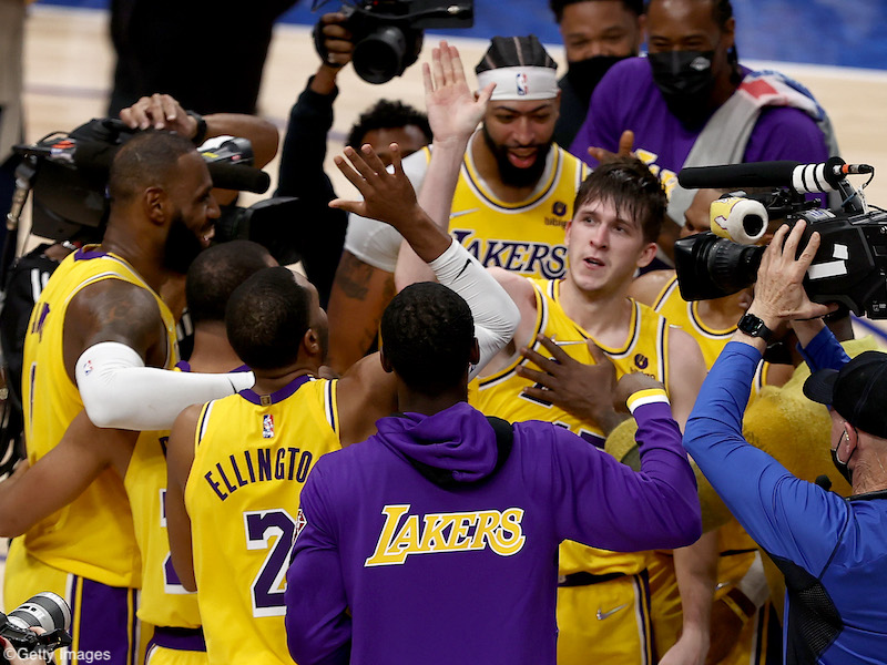 DALLAS, TEXAS - DECEMBER 15: Austin Reaves #15 of the Los Angeles Lakers reacts after shooting the game-winning shot against Tim Hardaway Jr. #11 of the Dallas Mavericks in overtime at American Airlines Center on December 15, 2021 in Dallas, Texas. (Photo by Tom Pennington/Getty Images)