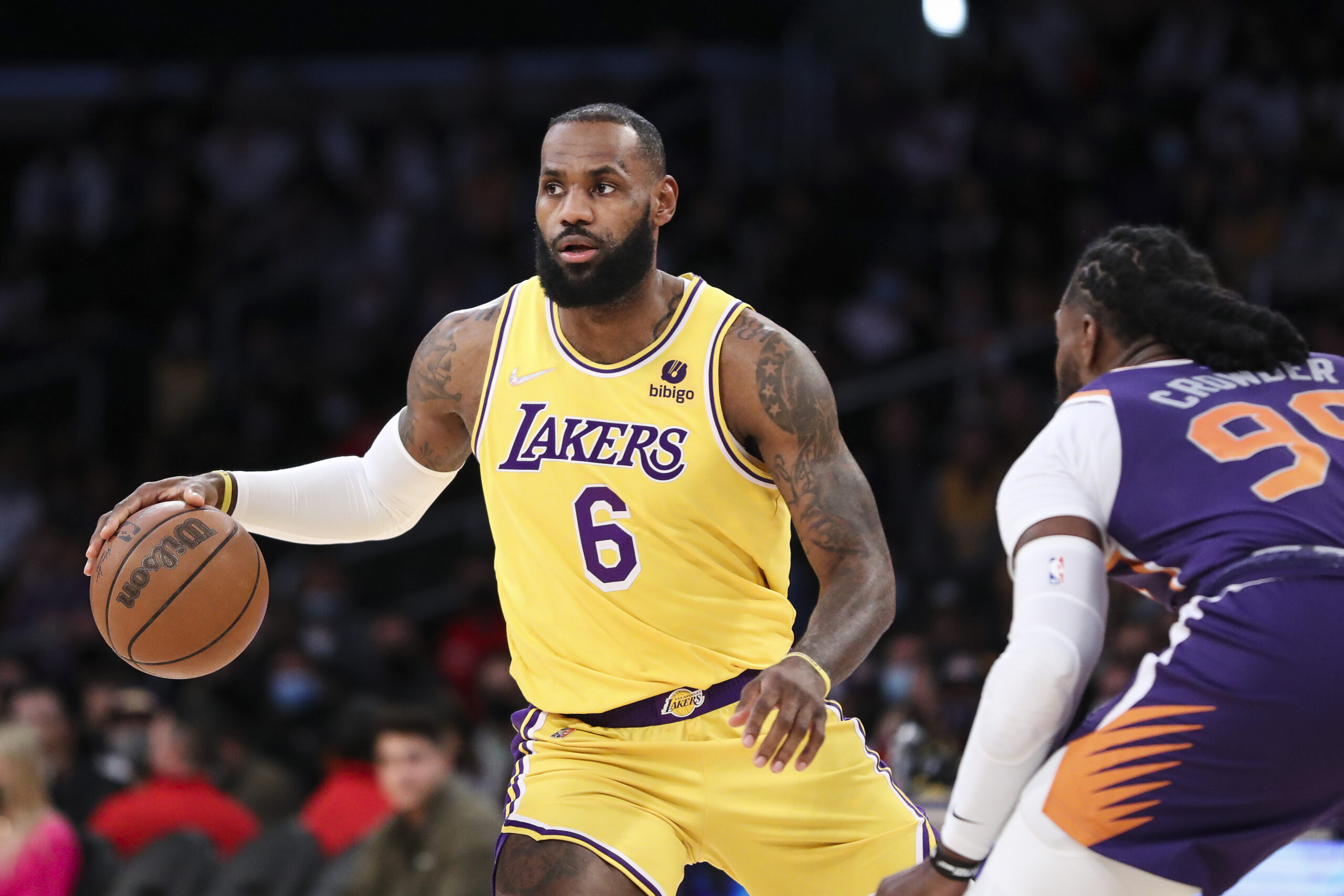 LOS ANGELES, CALIFORNIA - DECEMBER 21: LeBron James #6 of the Los Angeles Lakers handles the ball defended by Jae Crowder #99 of the Phoenix Suns in the first half at Staples Center on December 21, 2021 in Los Angeles, California. NOTE TO USER: User expressly acknowledges and agrees that, by downloading and/or using this photograph, User is consenting to the terms and conditions of the Getty Images License Agreement. (Photo by Meg Oliphant/Getty Images )