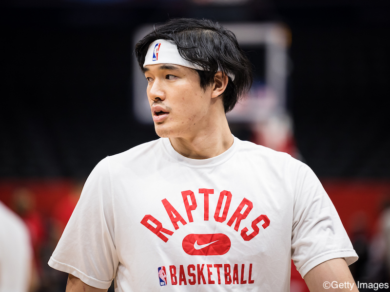 WASHINGTON, DC - JANUARY 21: Yuta Watanabe #18 of the Toronto Raptors looks on before the game against the Washington Wizards at Capital One Arena on January 21, 2022 in Washington, DC. NOTE TO USER: User expressly acknowledges and agrees that, by downloading and or using this photograph, User is consenting to the terms and conditions of the Getty Images License Agreement. (Photo by Scott Taetsch/Getty Images)